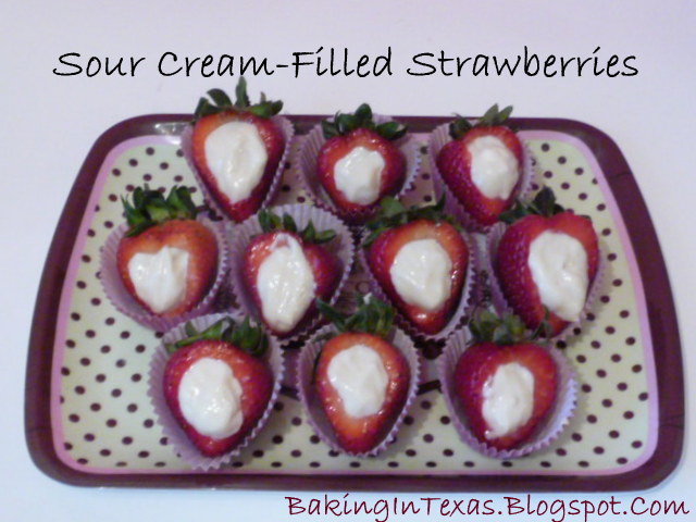 Mix the sour cream and sugar. It looks gritty like sand, but the sugar dissolves and turns the sour cream a light shade of vanilla. Transfer the filling to the ziptop bag. Squeeze out the air and seal the bag. Cut a small hole in one corner and pipe filling into each berry. Avoid overfilling.